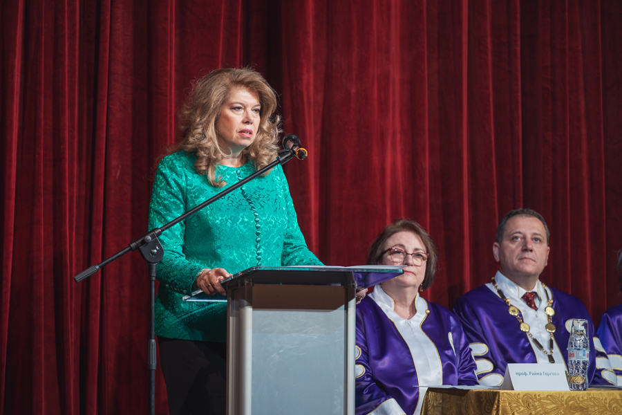 В поздравлението си към общността Президентът подчерта, че без медиците светът би бил „сурово и лишено от надежда място“. Тя открои значението на Медицински университет-София в изграждането на здравни специалисти. „Именно от децата, които възпитавате, ще излязат утрешните рицари на надеждата, на човеколюбието. Това ще бъдат нашите български лекари.“, заяви президентът. Тя допълни, че израстването на лекарите е резултат от дълга и устойчива традиция, която носи в себе си най-важните достижения не само на МУ-София, но и на българското образование.